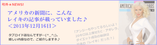◇ 「アンジーもやってるらしいよ! 20キロ以上痩せたC・アギレラ、ダイエット成功の秘訣は 日本の「レイキ」だった?」 ナショナルエンクワイアラー誌(national enquirer より)2013.12.16 ![]() (▲該当誌のページを探したら、すでに消えていたので、これは日本のウェブ画像です。) ◆理事長の辻耀子です。(^o^) いや〜、米新聞といってもゴシップ誌なんですよね(^_^;)。 (あまりにもキャッチーすぎる記事タイトルです…。) でも、嬉しい内容だったので、読んでみて下さい♪ レイキに好意的なので、元気が出ますよ! ◆以下、記事本文(日本語版)です。 (長文なので、レイキ関連箇所は色を変えておきました〜!)
